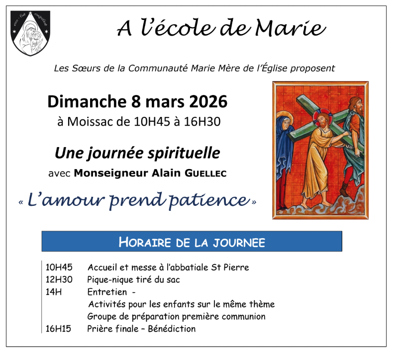 Les Sœurs de la Communauté Marie Mère de l’Église vous proposent une journée spirituelle le dimanche 8 mars 2026 à Moissac de 10H45 à 16H30 avec Monseigneur Alain GUELLEC sur le thème « L’amour prend patience »